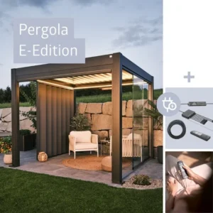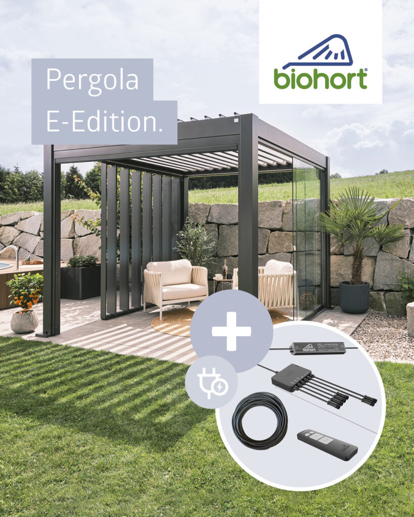 Al comprar una pérgola Biohort, ahora recibe un kit de control gratuito. Con la edición electrónica, usted cuenta con la base técnica necesaria para equipar eléctricamente su pérgola. Esto le garantiza estar perfectamente preparado, tanto si solicita los componentes eléctricos directamente como si los instala posteriormente.