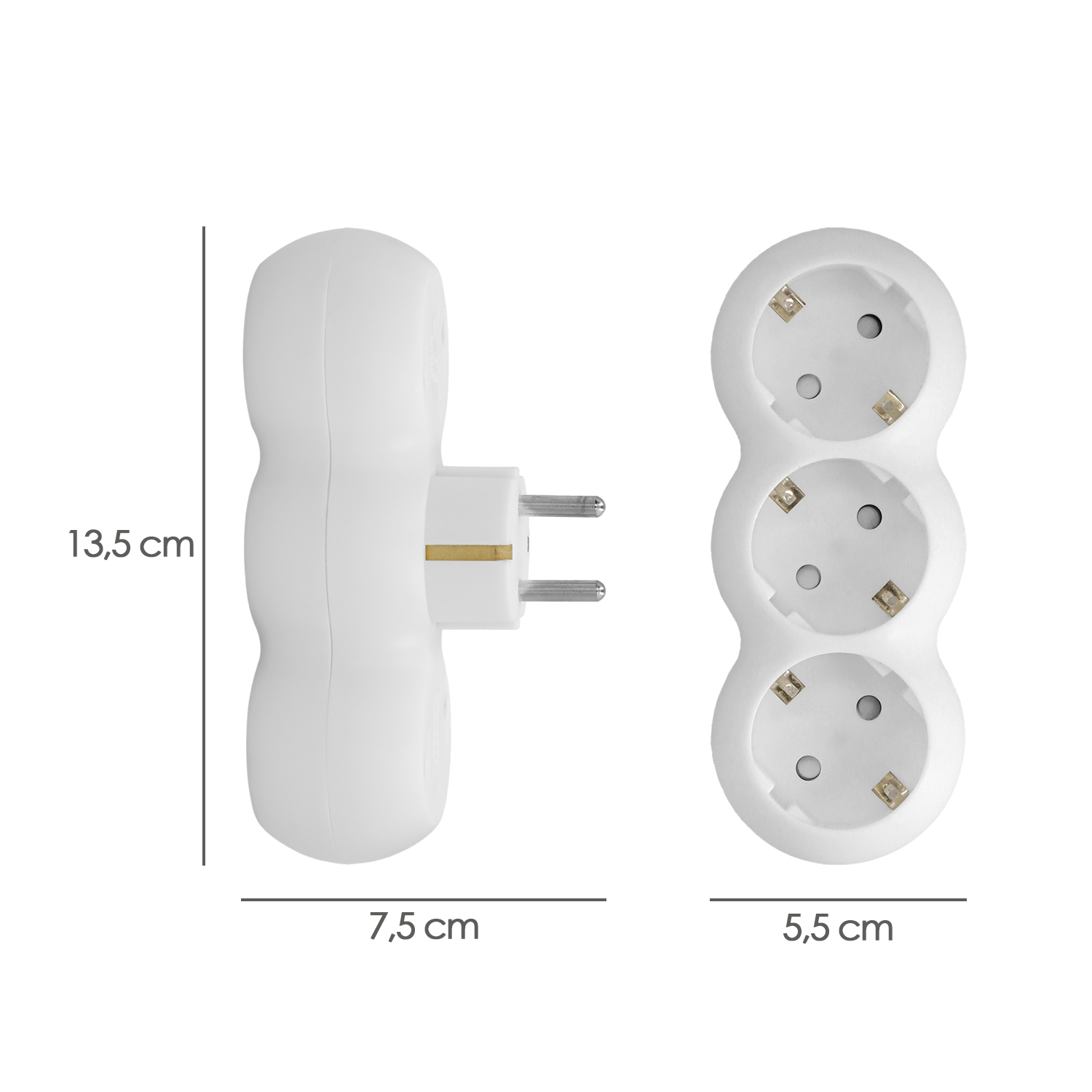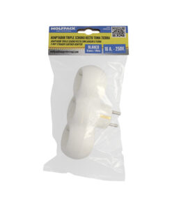 - Color blanco. Corriente máxima: 16 A. Tensión nominal: 250 V. Con toma de tierra en cada salida para mayor seguridad. Adaptador triple.
