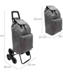 - Capacidad: 54 Litros. Medida de las ruedas: Ø 14 cm. Color Gris Jaspeado. Carro de la compra con seis ruedas, ideal para subir escalones con mayor facilidad. Bolsa principal con capacidad de 54 litros. Bolsa termica 5 litros. Bolsa térmica con cremallera, perfecta para productos congelados y frescos.