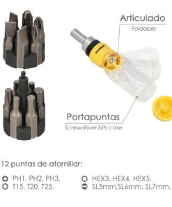 – Destornillador articulado, le permite llegar a lugares estrechos en los que un destornillador convencional no cabe.