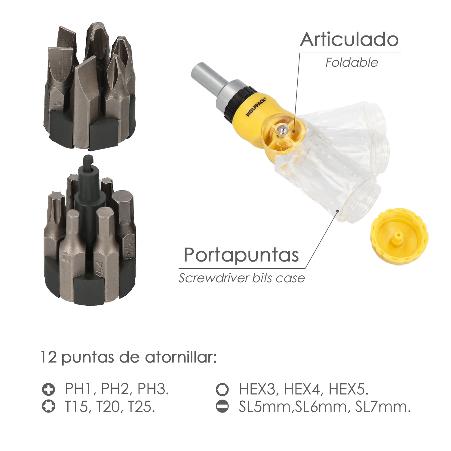- Incluye las siguientes puntas: > Phillips: 1 / 2 / 3 > Plano: 5 / 6 / 7 > Torx: 15 / 20 / 25 > Hexagonal: 3 / 4 / 5