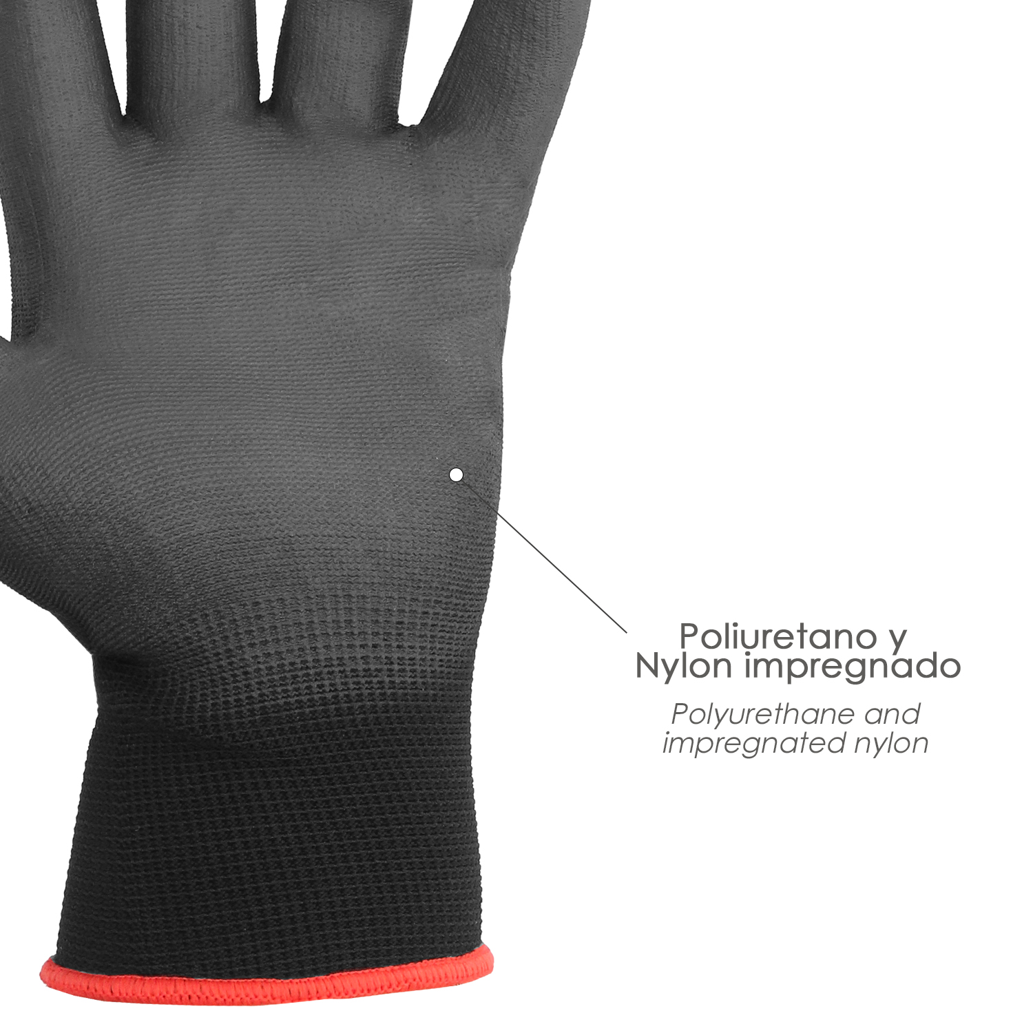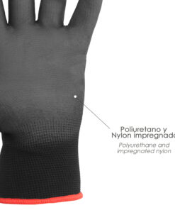 – Guante sin costura de Poliester gris, con recubrimiento en palma de poliuretano. Gran capacidad de adherencia y sujeción gracias a su recubrimiento antideslizante.