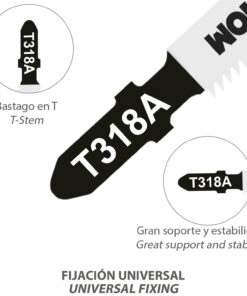 – Vastago en forma de T, compatible con la mayoría de modelos de sierra de calar.