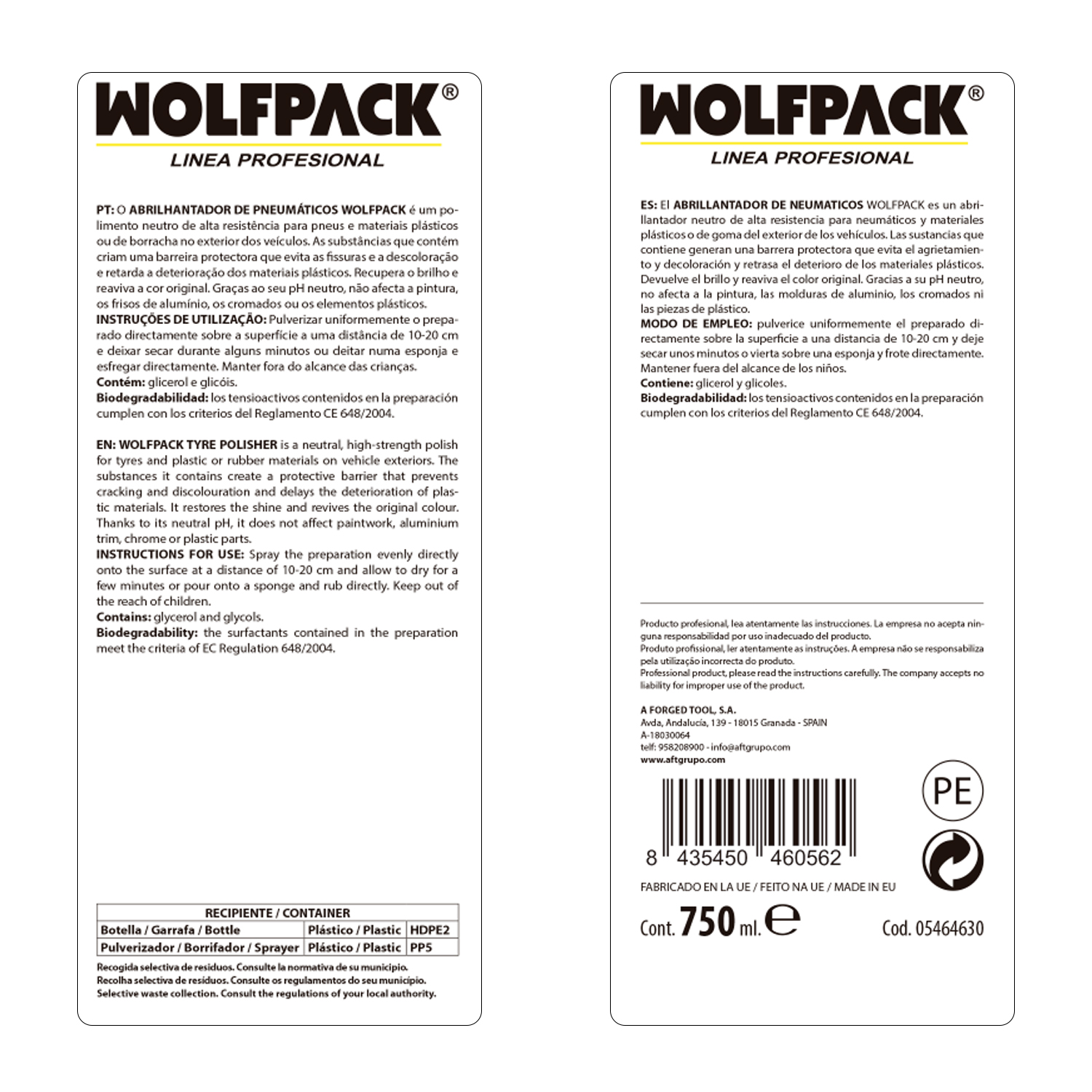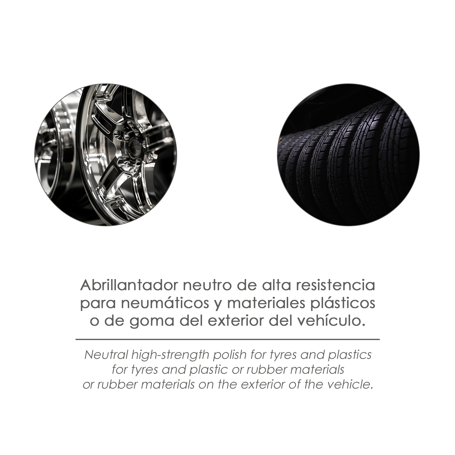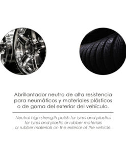 - Es un abrillantador neutro de alta resistencia ideal para la limpieza de neumáticos y materiales plásticos de exteriores de vehículos.