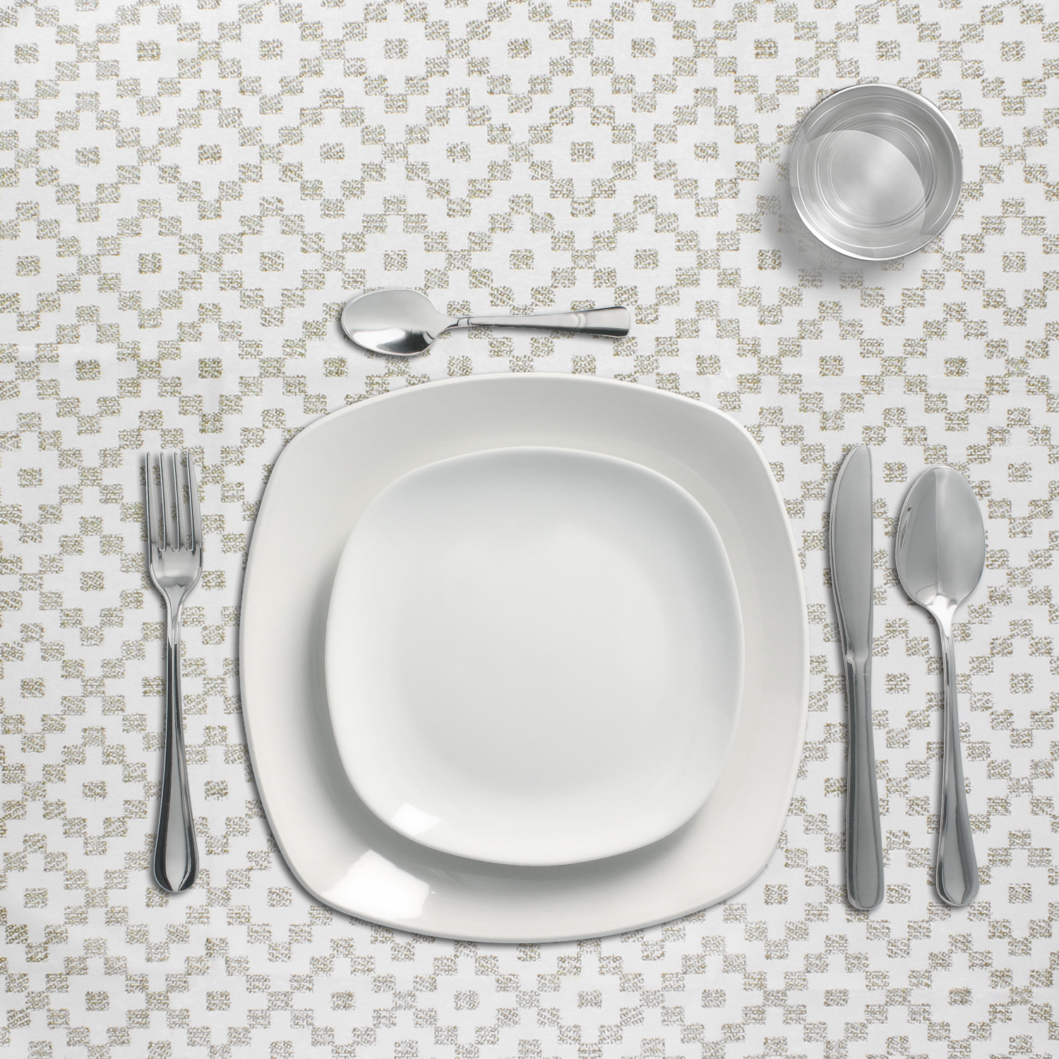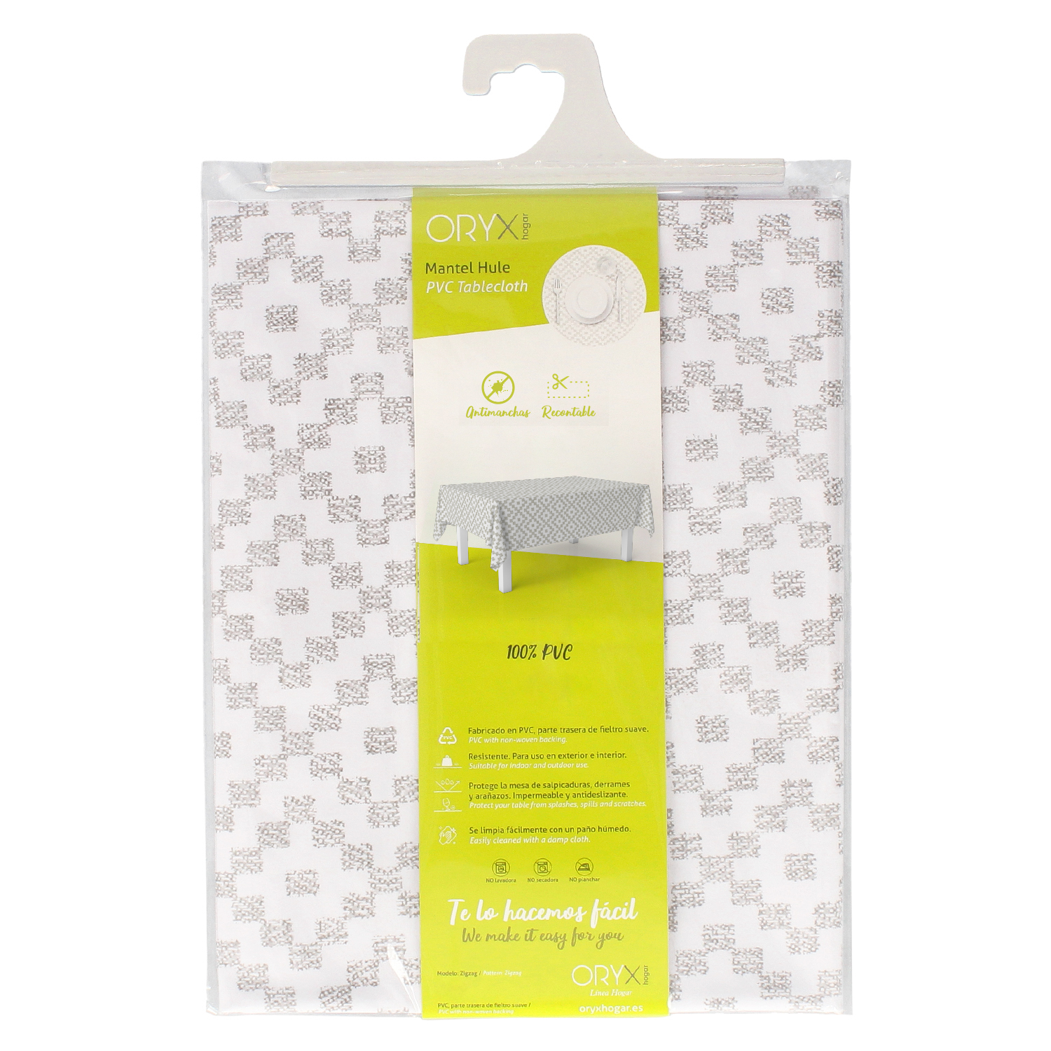 – Mantel Hule estampado en color blanco con formas grises en zigzag. Diseño moderno y elegante para cualquier ocasión.