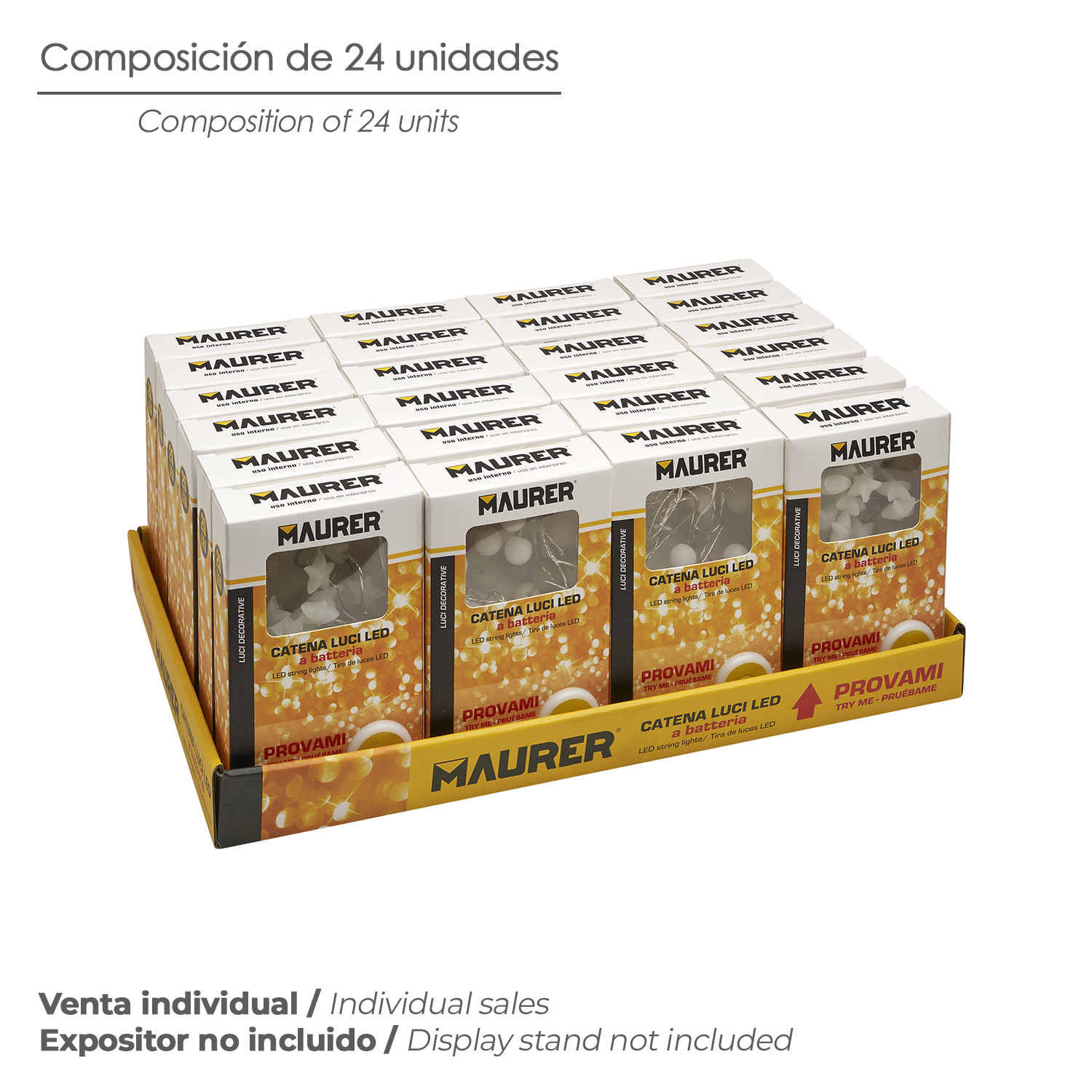 - Nº leds: 20 Leds. Funcionamiento 3 baterias AA. (No Incluidas) Luz fija. Color luz calida / Multicolor. Formas de estrellas / esferas. Valido para interiores (IP20).