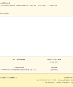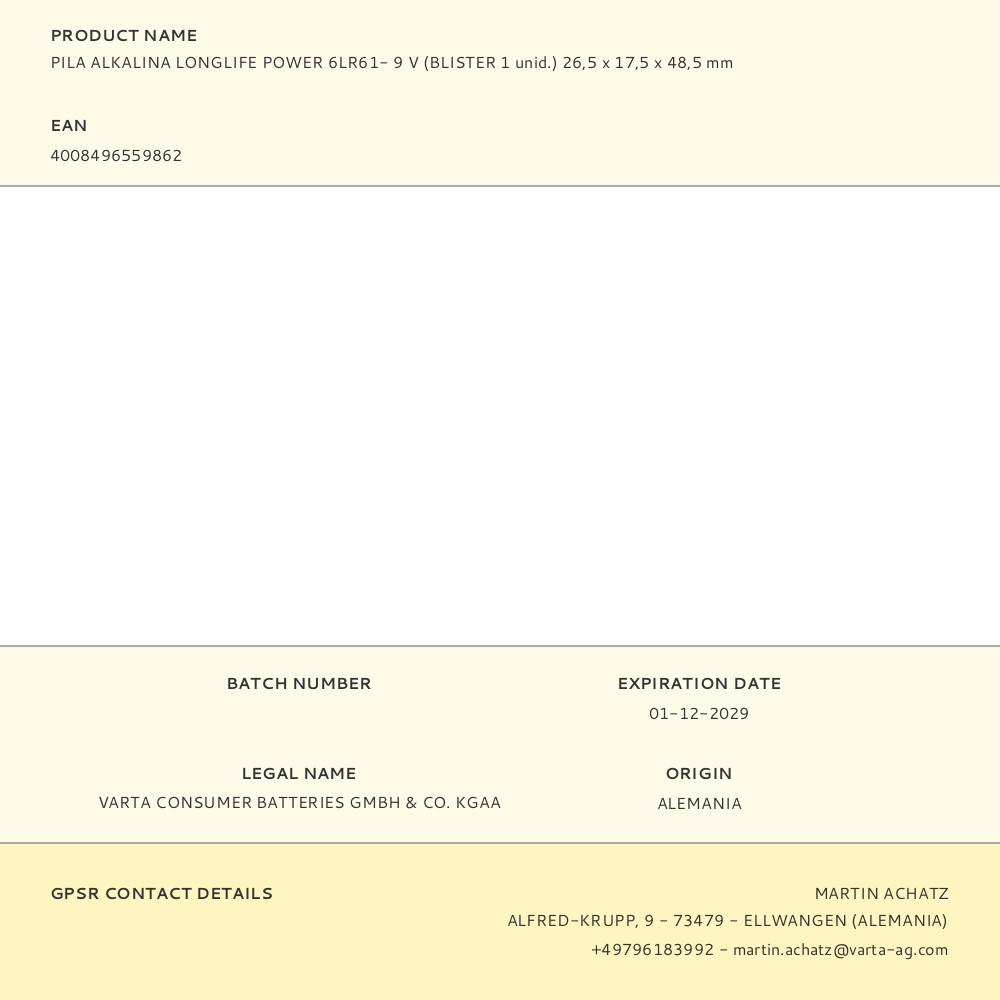 PILA VARTA ALKALINA LONGLIFE POWER 6LR61 9V (BLISTER 1 UNID.) 26,5X17,5X48,5MM