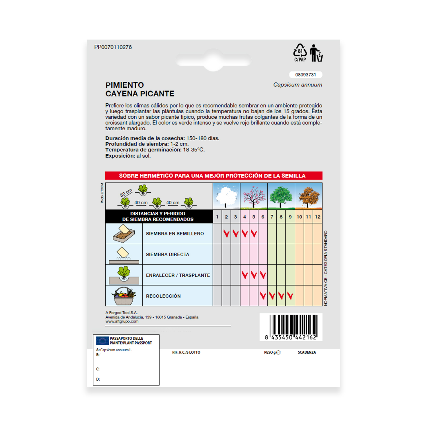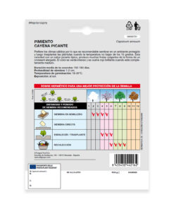 - Esta variedad con un sabor picante típico produce en abundancia frutas colgantes con una forma alargada. El color es verde intenso y cambia a rojo brillante cuando está completamente maduro. Duración media de la cosecha: 150-180 dias. Profundidad de siembra: 1-2 cm.