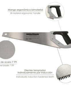 - Dientes del serrucho templados con triple afilado, cuenta con una separación de 7TPI, especialmente diseñado para maderas blandas, contrachapados, suelos, laminados, tuberías de plástico PVC/ABS, etc.