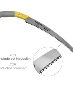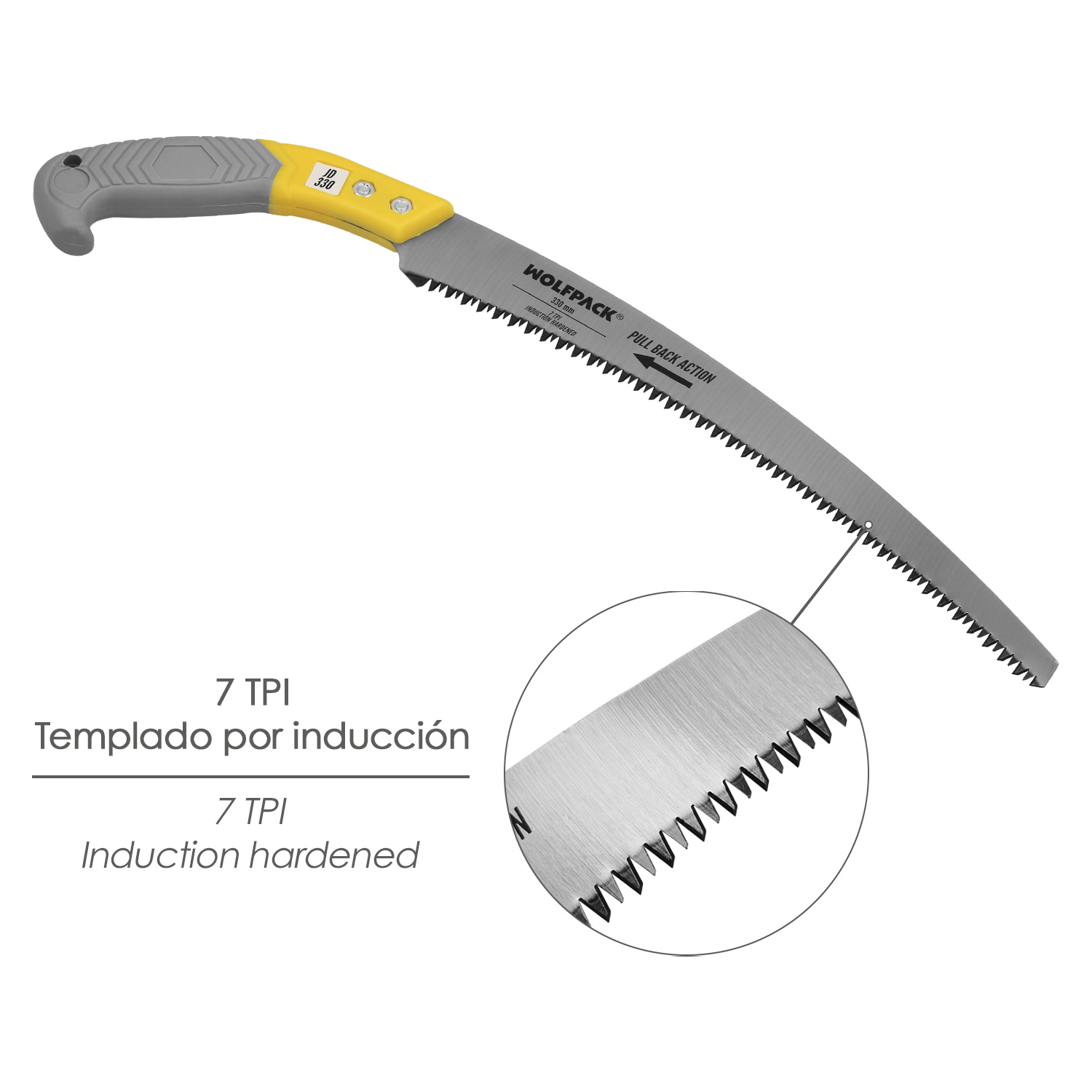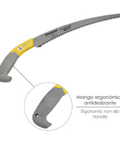 - Medida: 330 mm. Hoja realizada en acero templado. Diseño especial de los dientes hace que el afilado sea superfluo.
