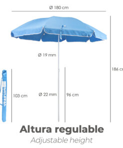 - Ajustable en altura e inclinación, desde 120 hasta 186 cm. Incluye bolsa con asa para guardar y transportar la sombrilla cómodamente.