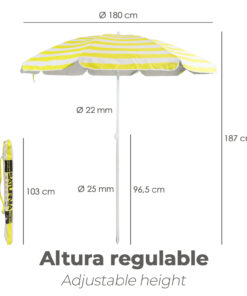 - Ajustable en altura e inclinación, desde 120 hasta 187 cm. Incluye bolsa con asa para guardar y transportar la sombrilla cómodamente.